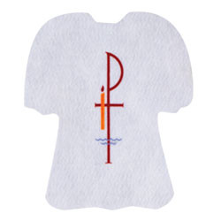 9" X 10" Baptismal bibs for infants with image of the Chi Rho. Beautiful multicolor design tastefully imprinted on white polyester felt.