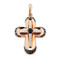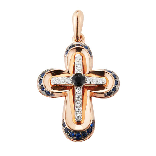 Rose Gold over Sterling Silver Cross. Rose gold cross has blue, black and crystal CZ stones. Cross comes on an 18" chain. A deluxe gift box is included. Made in the USA