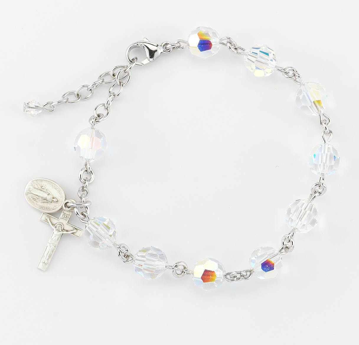 8mm Aurora Multi Faceted Swarovski Crystal Beads Rosary Bracelet. B.) All Sterling Silver links, chains and miraculous medal and crucifix; or BR) Rhodium plated solid brass links with a sterling silver miraculous medal and crucifix. Comes in a deluxe velour gift box. Made in the USA.