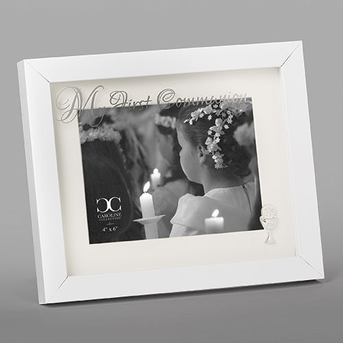 This Communion frame captures the beauty and significance of a child’s special day with its clean white design and thoughtful details. The frame is inscribed with “My First Communion” in graceful script across the top, while a silver chalice emblem rests in the corner, symbolizing the sacredness of the Eucharist. Designed to showcase a favorite photo, it makes a meaningful keepsake that preserves the memory of this milestone for years to come.